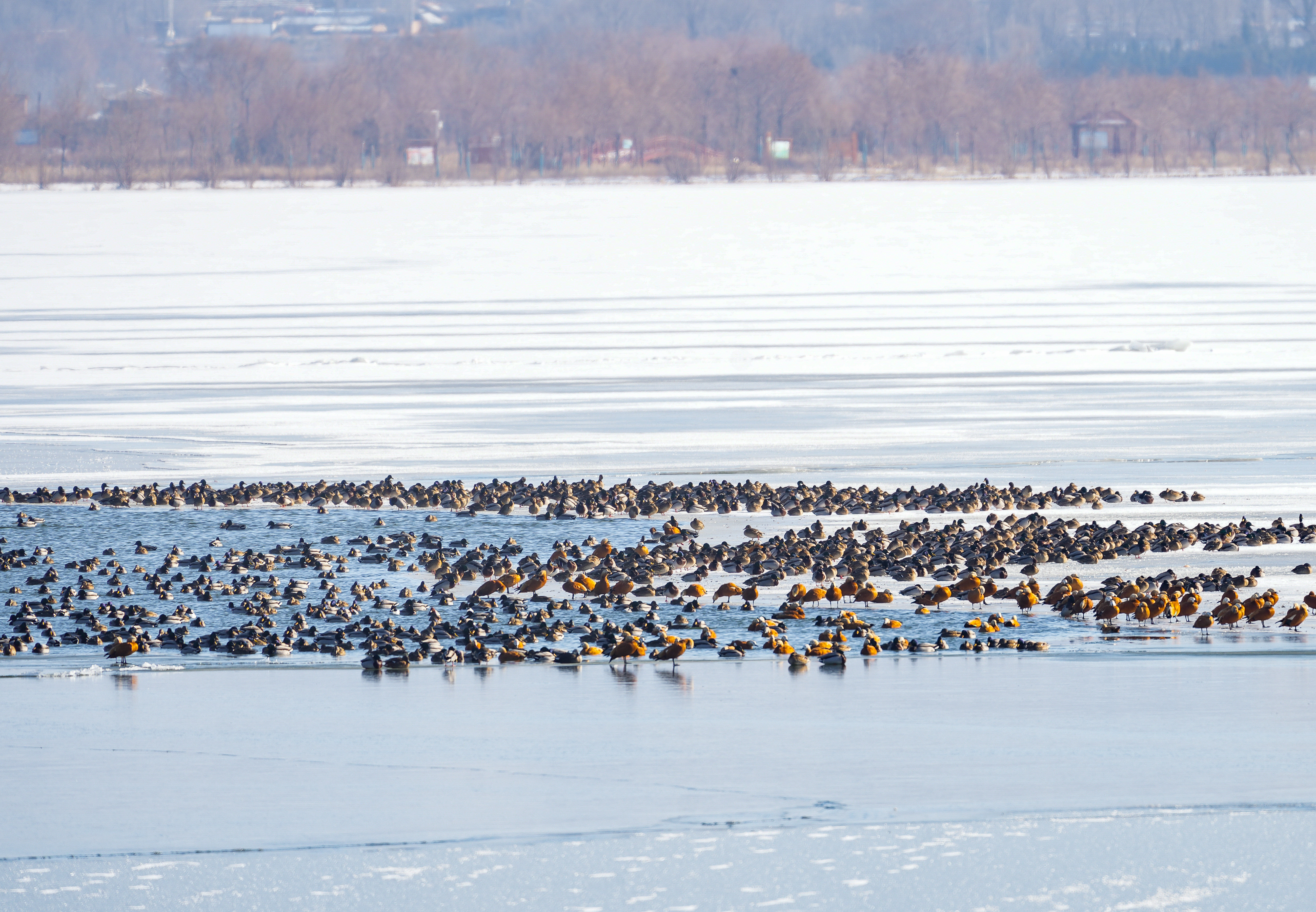 1月6日,雪后的沈家河生态湿地公园,清冷亦动人。水面如镜,映出澄澈天空,成千只绿翅鸭、豆雁等候鸟在此游弋觅食,时而掠过水面、时而集群休憩,为冬日湿地注入盎然生机。(记者:安 磊)