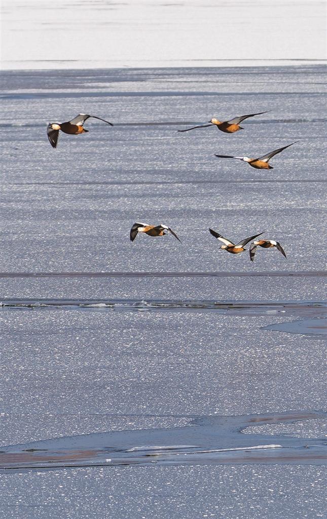 候鸟振翅翱翔在波光粼粼的冰面上。