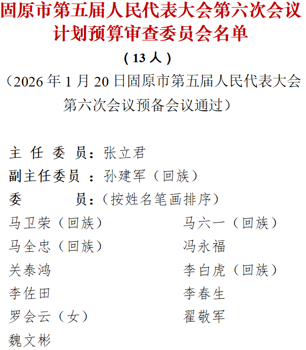 固原市第五届人民代表大会第六次会议计划预算审查委员会名单