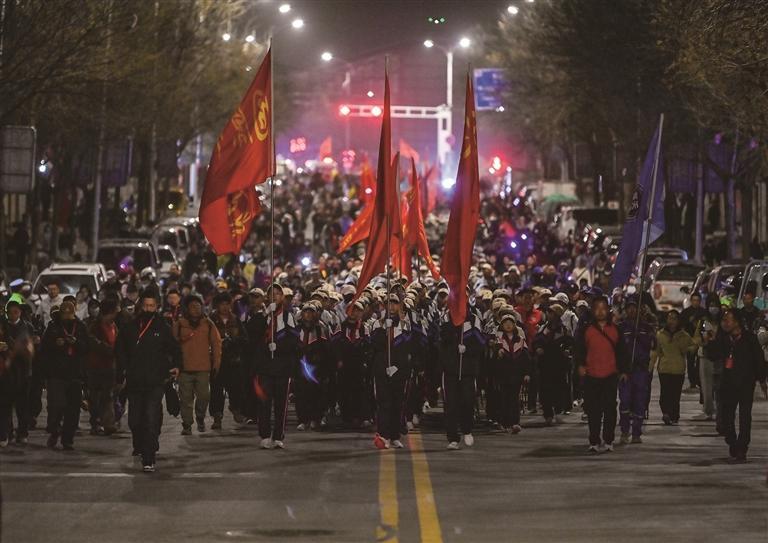 凌晨4时,天还黑着。宋小明和儿子宋锦睿已经出了宾馆,汇入固原二中、弘文中学徒步的队伍。人流浩浩荡荡,方向是54里外的任山河烈士陵园。