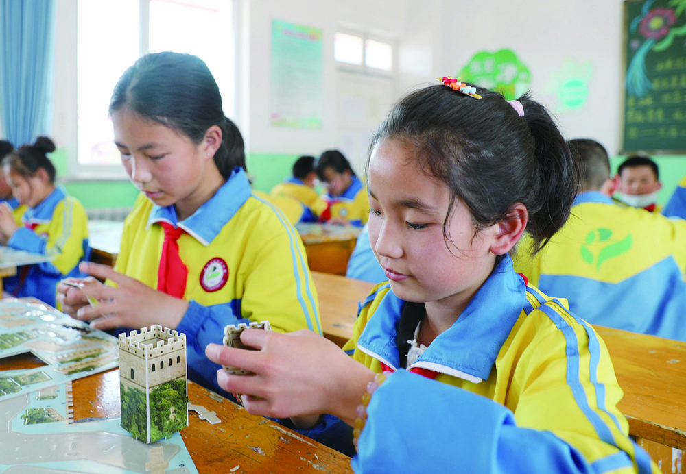 固原博物馆公益讲堂走进学校,引导学生参与长城拼图手作活动。
